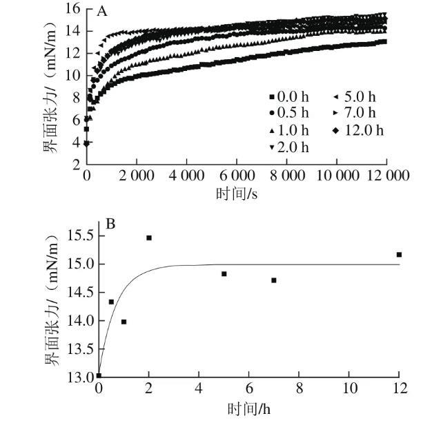 圖3纖維化過程中β-乳球蛋白在油水界面的吸附動力學過程(A)及其飽和界面張力(B)的變化