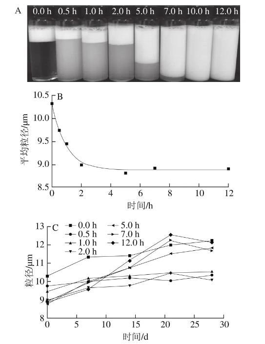 圖5纖維化轉變過程中β-乳球蛋白納米纖維穩定的乳液外觀(A)、平均粒徑(B)和常溫貯藏時粒徑(C)的變化