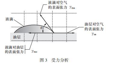 液滴爆炸現象的第二階段邊緣處的液滴產生液滴噴發現象,在該過程中液滴中部較厚的部分不斷向邊緣輸送液體,因此會穩定持續一段時間。為解釋這一階段,先從表面張力入手,因為接觸角的不同,水對油的表面張力大于乙醇對油的表面張力,則混合液體對油層的界面張力介于水和乙醇之間。混合液滴中乙醇的比例越大,混合液體對油層的界面張力越小,受到向內的張力減小,這樣整體向外的張力增大,這是產生向外推動的驅動力的重要原因??梢娊缑鎻埩χ苯記Q定了液滴在界面上的擴散和運動。