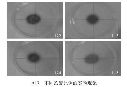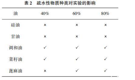 接下來再探究疏水性物質種類對液滴爆炸的影響,疏水性物質有很多種,在實際實驗中不可能將所有的疏水性物質一一嘗試,所以要找出選擇有限疏水性物質種類的標準。本文開始選擇了五種疏水性物質進行嘗試,實驗表明(如表2所示):對于硅油池與甘油池,沒有一個案例表現出液滴的擴散;對于食用調和油、菜籽油池,40%、60%和80%乙醇溶液液滴在降落到油池上后均立即自發地進行擴散;對于蓖麻油池只有40%乙醇溶液無液滴爆炸現象產生。由此可以得出液滴只在特定種類疏水性物質上“爆炸”,并猜測與油的黏性有關。