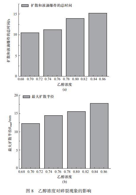 實驗5探究滴入液滴體積對液滴爆炸的影響,采用不同孔徑注射器,向高黏度蓖麻油油層上,滴入大液滴體積0.17 ml、小液滴體積0.08 ml的70%濃度的乙醇溶液,得到結論是:滴入更大的液滴會導致液滴爆炸總時間的延長和擴散半徑的增大。