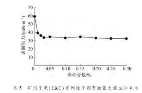 為了確定合理的表面活性劑添加濃度,分別選取了體積分數為0.01%,0.02%,0.03%,0.05%,0.1%,0.15%,0.2%,0.25%,0.3%的礦用塵克(C&C)系列除塵劑進行溶液表面張力測試,溶劑選用礦井水,測試儀器選用芬蘭Kibron EZ-Pi Plus便攜式動態表面張力儀,采用最大拉力法記錄圓環薄膜的拉伸破壞情況,從而計算出液體的表面張力。液滴表面張力越小,其與粉塵接觸后,更容易黏結沉降。測試結果如圖5所示。