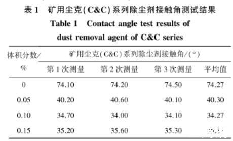 表1礦用塵克(C&C)系列除塵劑接觸角測試結果