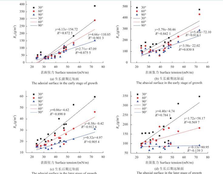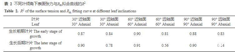 由表2結果可知,蘋果葉片生長前期近、遠軸面和生長后期近軸面,不同葉傾角下表面張力與Rm值擬合曲線的R2均高于0.80。而蘋果葉片生長后期遠軸面除30°時R2高于0.7外,其他葉傾角下均低于0.6,且隨著葉傾角增大,R2不斷減小,這表明蘋果葉片生長后期遠軸面的表面張力與Rm值之間的線性關系較差。