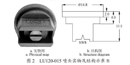 試驗(yàn)噴頭為德國(guó)LECHLER公司生產(chǎn)的空氣誘導(dǎo)噴頭IDK120-025和多量程平面噴頭LU120-015,其結(jié)構(gòu)及尺寸如圖1和圖2所示。