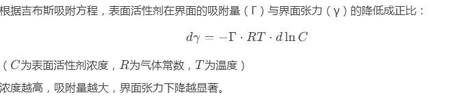根據吉布斯吸附方程,表面活性劑在界面的吸附量(Γ)與界面張力(γ)的降低成正比: