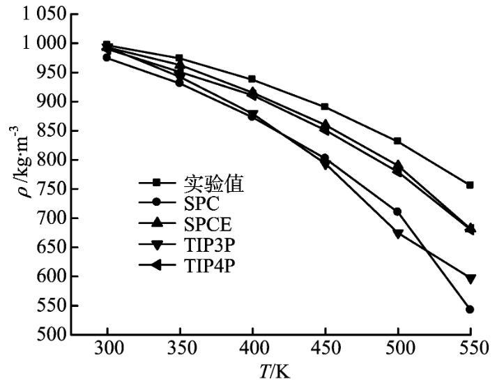 將四種水分子模型模擬得到的不同溫度下的液相主體密度與實驗值比較,如圖5所示。由圖5可見,四種模型的模擬值和實驗值相比都偏低,且溫度越高,模擬值與實驗值的誤差越大;SPCE和TIP4P模型得到的液相密度與實驗值的誤差較小。