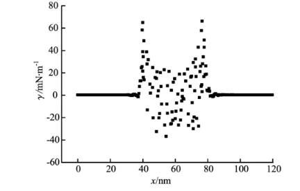 模擬水分子數N1=3 000,十二烷基硫酸鈉數N2=20,溫度T=300 K,水—表面活性劑體系的局部界面張力見圖10。由圖10可知,從汽相主體向液相過渡過程中,界面張力值逐漸增加,在氣—液界面區達到峰值;在液相主體又在零值附近波動。