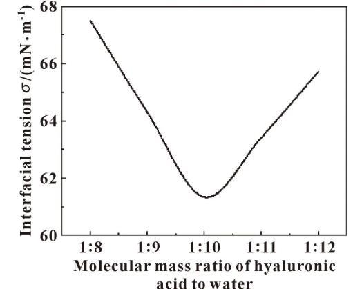 分子動力學中認為界面張力與不同方向上的壓力張量有關(guān),仿生黏液透明質(zhì)酸體系-水的界面張力通過KIRKWOOD和BUFF提出的力學定義來進行計算。通過對5個不同質(zhì)量比的體系在平衡后200 ps的數(shù)據(jù)進行統(tǒng)計,得到了一個仿生黏液和水界面的界面張力平均結(jié)果,如圖1所示。可見在研究的質(zhì)量比范圍內(nèi),透明質(zhì)酸仿生黏液與水的界面張力始終保持在(60.00±10)mN/m左右,其中透明質(zhì)酸和水分子的質(zhì)量比接近1∶10時,界面張力最小(為61.33 mN/m)。仿生黏液和水界面的界面張力越小,體系中仿生黏液和水界面的自由能就越低,界面就較穩(wěn)定。因此,可以認為在研究的質(zhì)量比范圍內(nèi),質(zhì)量比1∶10時,模擬黏液-水的界面穩(wěn)定性最優(yōu)。這同時也證明,通過分子動力學模擬的方法可以初步預測仿生黏液在水體中的穩(wěn)定性。