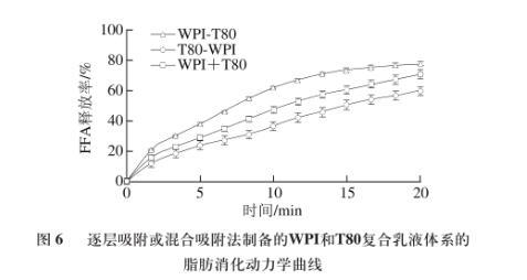 由圖6可知,采用WPI乳化均質再添加T80吸附的乳液(WPI-T80),其消化速率和FFA釋放程度最大,其次是將WPI和T80混合后乳化均質制備的乳液(WPI+T80),T80乳化均質再添加WPI吸附的乳液(T80-WPI)消化速率最慢。