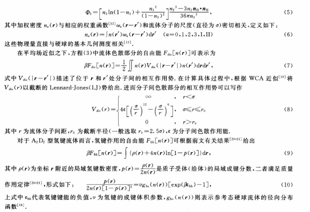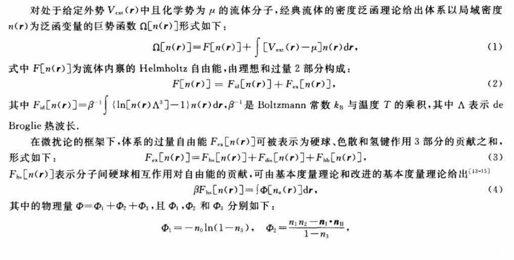 在微擾論的框架下,體系的過(guò)量自由能Fex[n(r)]可被表示為硬球、色散和氫鍵作用3部分的貢獻(xiàn)之和,形式如下: