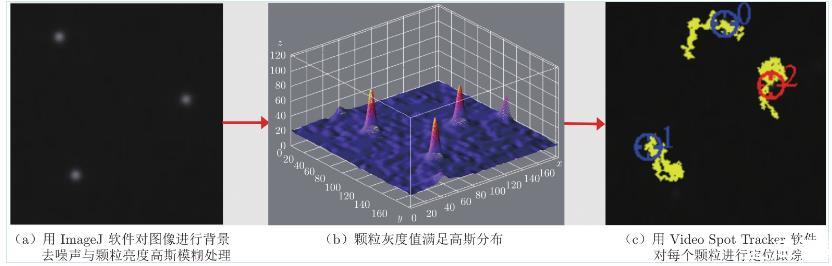 實驗采用Olympus顯微鏡(配備60倍物鏡)觀察顆粒在膜上的布朗運動,同時利用電子增益高速攝像機(Andor 897 EMCCD)進行拍攝。每個視頻拍攝時間為200 s,幀頻為0.05 s,曝光時間5 ms,圖像尺寸為300像素×300像素,分辨率為0.26μm/m。采集原始圖像中的顆?;叶戎挡环蠘藴矢咚狗植?,因此使用圖像處理軟件ImageJ對圖像進行背景去噪聲(Background Subtraction)和高斯模糊(Gauss-ian Blur)處理(圖3(a)),使顆粒灰度值達到標準高斯分布(圖3(b))。之后用Video Spot Tracker軟件定位每個顆粒的灰度峰值(圖3(c)),即顆粒質(zhì)心,定位誤差僅為0.5像素,進而對顆粒二維運動軌跡(平面)進行實時跟蹤。軟件自動將顆粒在每一時刻的像素位置坐標存入計算機中,使用MATLAB計算顆粒在不同時間間隔Δt內(nèi)沿和方向的位移,計算公式如下: