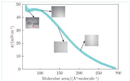 圖2為膜表面壓強隨膜密度的變化曲線,(以DPPC磷脂分子所占平均面積作為衡量膜密度的物理量)。在顯微鏡下觀察了膜在不同密度下的形貌(圖2中4張照片)。膜被壓縮到100?2/molecule之前,處于液態(tài)擴張(Liquid Expanded,LE)相,磷脂分子排列較松散,膜表面結(jié)構(gòu)均勻。當膜被壓縮到60~100?2/molecule時,膜上開始出現(xiàn)直徑為幾微米的磷脂凝聚(Tilted Condensed,TC)相(照片中斑點),TC區(qū)域內(nèi)磷脂分子的排列比LE區(qū)域更緊密。熒光劑Texas red DHPE傾向于分布在LE區(qū)域,因此LE區(qū)域顯示為淺色,TC區(qū)域顯示為深色。膜繼續(xù)被壓縮,在LE?TC共存相階段,膜表面壓強恒定在45 mM/m左右,TC區(qū)域數(shù)量和面積占比增大。當膜被進一步壓縮(<60?2/molecule),此時膜表面幾乎被TC區(qū)域占據(jù),TC區(qū)域相互擠壓,導(dǎo)致膜表面壓強直線上升,LE區(qū)域僅存在于TC區(qū)域之間的空隙。