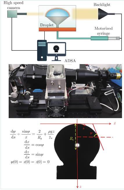 采用課題組自主研發(fā)的約束液滴表面測量儀(Constrained Drop Surfactometry,CDS)測量膜在不同密度下的表面張力,如圖1所示,圖中x與z分別代表水平與豎直方向,s代表液滴表面切向方向,ψ為液滴表面與水平方向內(nèi)夾角,R0為液滴半徑,ρ為液滴密度,g為重力加速度。CDS上的圓形基座用于盛放純水液滴(約10μL),以微量進樣針將稀釋的固爾蘇–氯仿溶液滴定到液滴表面,形成形狀類似于肺泡的水?氣界面固爾蘇肺表面活性劑膜。基座中央的小孔通過導(dǎo)管與注射器相連,注/抽水速度由Labview編程的推進器控制,以此調(diào)節(jié)液滴表面積的變化速率。實驗測量的是膜在壓縮過程中表面張力與膜密度變化的關(guān)系,液滴表面積以0.05的準靜態(tài)速率縮小。液滴的輪廓由照相機拍攝。膜表面張力和表面積以ADSA(Axisymmetric Drop Shape Analysis)方法分析得出。膜表面壓強,其中,純水表面張力。