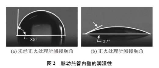 將去離子水滴在未處理和處理過的銅表面上,研究氧乙炔正火處理表面的潤濕性,采用POWE-REACHJC2000D1測量了液固靜態接觸角,結果如圖2所示。由圖可見,未處理表面和正火處理表面的接觸角分別為88°和27°。氧乙炔正火處理表面與未處理的銅表面相比,接觸角減小,表明表面潤濕性的提高。