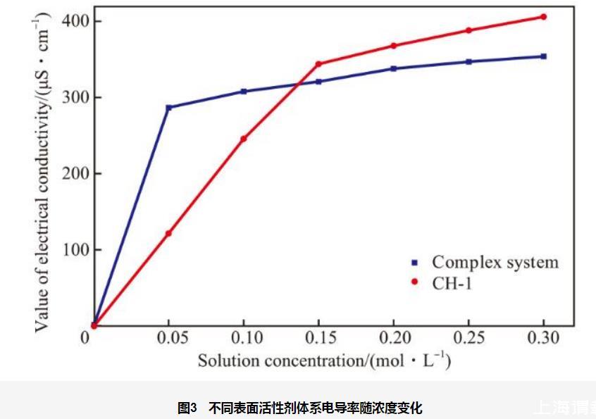 由圖3可看出,兩種表面活性劑的電導(dǎo)率均隨濃度的增加呈先迅速增大后緩慢增長的趨勢。這是因為表面活性劑濃度低于cmc時,表面活性劑主要以單體形式存在,單體中的離子可在溶液中自由移動,從而增加了溶液的導(dǎo)電能力;當(dāng)表面活性劑濃度高于cmc時,一部分離子被包裹在膠束內(nèi)部,使得自由移動的離子數(shù)量增加幅度減小,遠(yuǎn)小于濃度低于cmc時電導(dǎo)率隨濃度增加的幅度。陽-非離子復(fù)合表面活性劑電導(dǎo)率轉(zhuǎn)折點時的濃度低于CH-1電導(dǎo)率轉(zhuǎn)折點時的濃度。這是因為復(fù)配后,離子型表面活性劑的離子頭基與非離子表面活性劑的極性頭基之間可通過靜電引力、離子-偶極等作用相結(jié)合。這種相互作用增強了表面活性劑分子在界面上的吸附能力和在溶液中的聚集能力,使得形成膠束所需的濃度降低,即cmc減小。