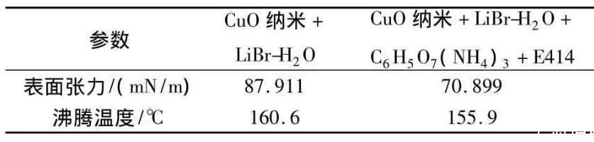 為了便于觀察3種表面活性劑對納米LiBr——H2O表面張力和沸騰溫度的影響,實(shí)驗(yàn)測量了不含此3種表面活性劑的納米LiBr——H2O的表面張力和沸騰溫度,見表1。