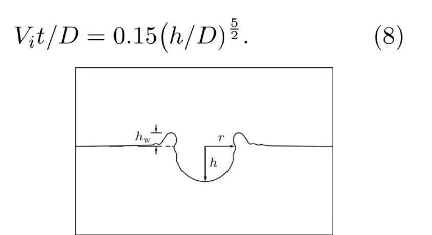 3)液滴撞擊深水液池后,空腔深度先以較快速度增長,在到達最大空腔深度后快速回彈,至接近原自由液面后速度逐漸放緩。在忽略毛細波作用、空腔深度為h=D至h=hmax范圍內的前提下,空腔深度隨時間的成長關系可由(Vit)/D=0.15(h/D)5/2來描述,但最終空腔底部的形成是由毛細波運動決定的;空腔寬度的增長主要由毛細波運動及其干擾驅動,最后在慣性力作用下線性增長。
