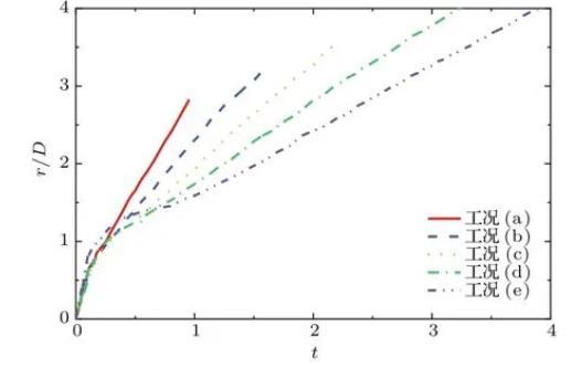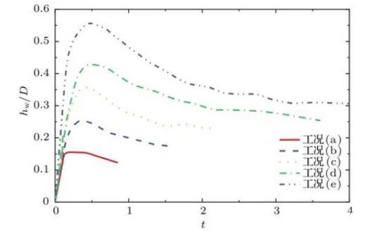 圖7及圖8分別為不同工況下波浪隆起高度hw和空腔寬度r隨時間的變化過程。由圖7易得,水滴撞擊水池后波浪高度的變化過程也經歷了從快速增長到逐漸回落,最終在慣性力的作用下自主運動,趨于穩定的過程。隨著弗勞德數的增大,更大的垂向速度在創造更深空腔的同時激發了更高的最大波浪隆起高度。從圖8可以看出,空腔寬度的增長與波浪的運動息息相關,在撞擊產生的動能與波浪自身重力勢能基本耗散后,空腔運動主要由毛細波及其干擾驅動,最后在慣性下線性增長。毛細波現象在圖8工況(e)的t=0.8時非常顯著,其周期在圖6的t=1.5—2.5中也有體現。