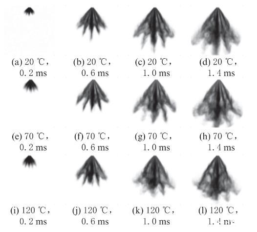 圖5不同環(huán)境溫度和噴霧開始后時刻下乙醇的噴霧形態(tài)