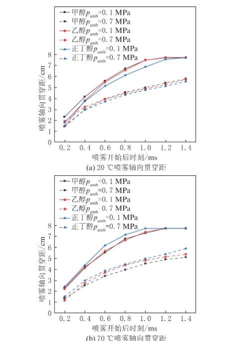 環(huán)境溫度升高至70℃、120℃時,正如圖8(b)和圖8(c)呈現(xiàn)出的,正丁醇的噴霧軸向貫穿距高于甲醇和乙醇,這與常溫常壓的環(huán)境條件下完全相反。盡管正丁醇的潛熱較低,但環(huán)境溫度和壓力的升高使甲醇和乙醇的過熱度高于正丁醇,進而引發(fā)更高的顯熱,提升了甲醇和乙醇的蒸發(fā)率,導致醇束發(fā)展緩慢。
