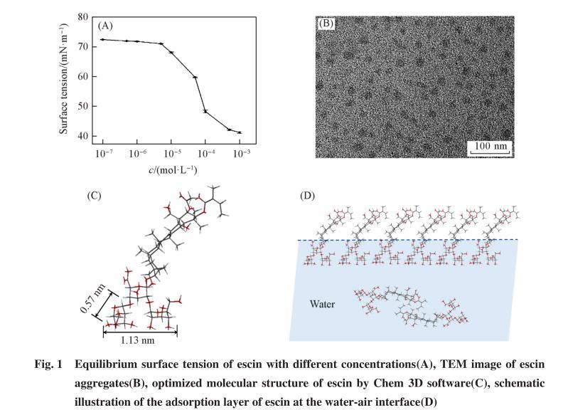 首先,采用吊片法測量了不同濃度七葉皂素溶液的表面張力.由于七葉皂素溶解度的限制,當(dāng)濃度超過1×10-3mol/L時(shí)會(huì)有少量固體物質(zhì)析出,影響測試結(jié)果,故表面活性測試的濃度范圍為1×10-7~1×10-3mol/L.如圖1(A)所示,隨著七葉皂素濃度的增加,表面張力呈現(xiàn)先基本不變、后快速下降、最后達(dá)到平衡的3個(gè)階段.這是由于濃度低于1×10-5mol/L時(shí),只有少量七葉皂素分子吸附在氣-液界面,表面張力基本不變;然后隨著濃度增加,越來越多的分子遷移并吸附在氣-液界面,使溶液表面張力快速下降;當(dāng)分子在界面吸附達(dá)到飽和(5×10-4mol/L)后,開始在體相聚集形成膠束,表面張力不再改變.可知,七葉皂素的臨界膠束濃度(cmc)為5×10-4mol/L,對(duì)應(yīng)的表面張力(γcmc)為42.1 mN/m.圖1(B)為七葉皂素形成聚集體的TEM照片,膠束大小約為20 nm.