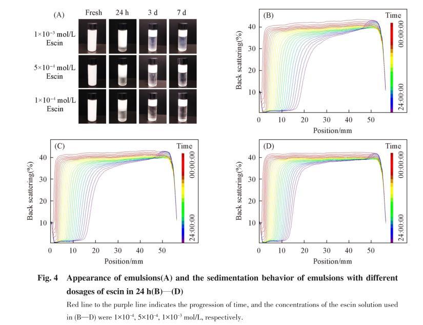 可見,七葉皂素濃度為1×10-4和5×10-4mol/L時(shí),在24 h內(nèi)分層較明顯,前者的分層程度略大于后者,當(dāng)濃度為1×10-3mol/L時(shí),分層得到明顯抑制,較為穩(wěn)定,該現(xiàn)象與貯存穩(wěn)定性表征結(jié)果一致[圖4(A)].這是由于兩親性的七葉皂素分子結(jié)構(gòu)具有較多的含氧基團(tuán)(羥基和羧基),在油-水界面層具有強(qiáng)分子間作用(氫鍵),高濃度形成的界面膜的收縮彈性強(qiáng)于低濃度,在油-水界面發(fā)生形變時(shí),界面膜產(chǎn)生相應(yīng)形變而非解吸附,因此高濃度七葉皂素所形成的乳液穩(wěn)定性相對(duì)更好.