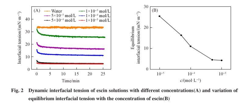 使用視頻光學(xué)接觸角測量儀,利用懸滴法測定溶劑油150#和不同濃度七葉皂素溶液的油-水界面張力.溶液為內(nèi)相,溶劑油150#為外相.將七葉皂素溶液置于氣密性良好的注射器(針管外徑為1.65 mm)中,利用步進(jìn)馬達(dá)將溶液(8μL)注射到裝有溶劑油150#的玻璃皿中,CCD攝像機(jī)同步記錄測定過程的液滴狀態(tài)(每次測定25 min),軟件通過液滴形狀分析計(jì)算出界面張力.分別測定超純水以及不同濃度七葉皂素溶液與溶劑油150#的界面張力,每個(gè)樣品重復(fù)測3次.