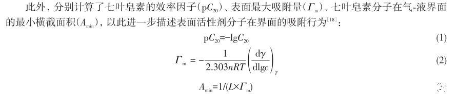 此外,分別計(jì)算了七葉皂素的效率因子(pC20)、表面最大吸附量(Γm)、七葉皂素分子在氣-液界面的最小橫截面積(Amin),以此進(jìn)一步描述表面活性劑分子在界面的吸附行為: