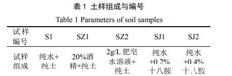 試驗用土取自云南省境內昆曲高速公路嚴家山段,為淺灰色弱膨脹土,其自由膨脹率為55.7%,液限為41%,塑限為20.3%。取回的土樣經過風干、碾碎后過2 mm的篩備用。為研究氣–液界面張力對膨脹土干縮開裂的影響,采用3種不同表面張力的液體作為土中的液相,分別為:純水、體積百分數為20%的酒精溶液和含量為2 g/L的肥皂水;通過在土體中混合斥水劑的方法配制不同接觸角的土樣,斥水劑十八烷基伯胺(C18H39N),簡稱:十八胺,為堿性白色蠟狀粉末,純度為99%,配制兩種斥水土樣,十八胺含量分別為:0.2%和0.4%。各土樣的成分和編號如表1所示。