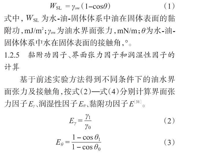 式中,WSL為水-油-固體體系中油在固體表面的黏附功,mJ/m2;γow為油水界面張力,mN/m;θ為水-油-固體體系中水在固體表面的接觸角。