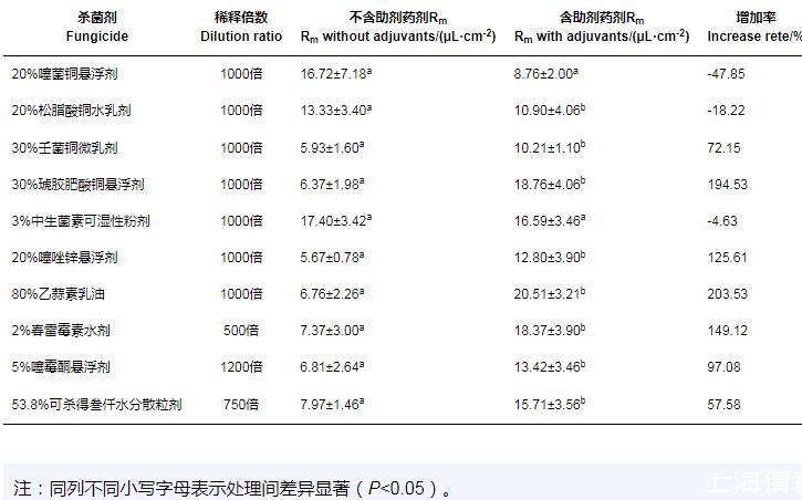 加入助劑前后,除20%噻菌銅懸浮劑、20%松脂酸銅水乳劑和3%中生菌素可濕性粉劑在‘貴妃'芒果葉片上的最大持留量(Rm)無(wú)顯著差異外,其他殺菌劑的Rm值均呈顯著差異。其中,80%乙蒜素乳油和30%琥膠肥酸銅懸浮劑的Rm值分別為(6.76±2.26)μL/cm2和(6.37±1.98)μL/cm2,加入助劑后藥液在葉片上的最大持留量可達(dá)(20.51±3.21)μL/cm2,效果最好,分別為增加了203.53%和194.53%。加入助劑后,藥液在單位面積葉片持留量的增加率從大到小依次為,80%乙蒜素乳油>30%琥膠肥酸銅懸浮劑>2%春雷霉素水劑>20%噻唑鋅懸浮劑>5%噻霉酮懸浮劑>30%壬菌銅微乳劑>53.8%可殺得叁仟水分散粒劑,持留量增加率分別為203.53%、194.53%、149.12%、125.61%、97.08%、72.15%和57.58%(表3)。