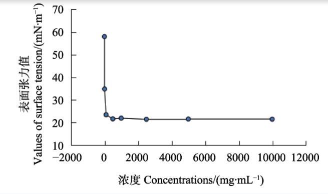 按國(guó)家標(biāo)準(zhǔn)GB 5549—2010的方法,將助劑380配置成1、10、100、1000、10 000、100 000 mg/mL系列濃度,用表面張力儀測(cè)定相應(yīng)濃度藥液的表面張力。以濃度和其對(duì)應(yīng)的表面張力值分別為橫縱坐標(biāo)作圖,獲得一條曲線,曲線拐點(diǎn)對(duì)應(yīng)的濃度即為助劑380的臨界膠束濃度。