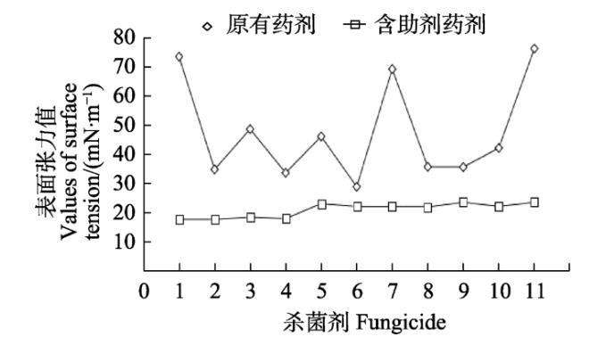 參照各供試殺菌劑田間推薦劑量,分別配置10 mL藥液2組,其中一組添加助劑,一組不含助劑。通過(guò)表面張力儀測(cè)試各藥液的表面張力值。每組設(shè)置3個(gè)重復(fù),以水作為空白對(duì)照。
