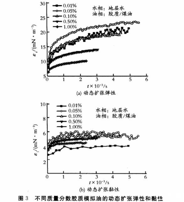 從圖3(a)中可以看出,在實驗初期,膠質分子在界面的吸附較少,膜內分子間相互作用較弱,擴張彈性較低;隨界面老化時間增加,活性分子在界面上富集,界面吸附膜排列更加緊密,膜內分子間作用力增強,彈性也隨之明顯增大;當界面吸附接近平衡時,彈性也接近其平臺值。對比圖1和圖3(a)可知,不同質量分數膠質動態界面擴張彈性與動態界面張力隨時間變化的趨勢基本上是一致的。