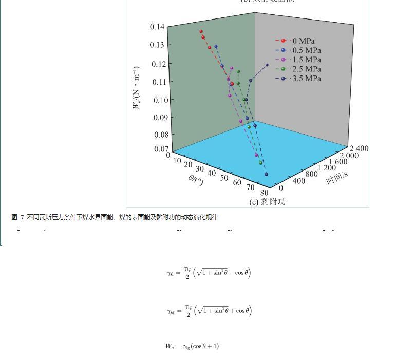 由圖7a可知,同一瓦斯壓力條件下,煤水界面能隨著潤濕時(shí)間的增加而減小,隨著接觸角的減小而減小。因?yàn)槊核缑婺茉叫?,水分越容易在煤體表面鋪展。同一時(shí)刻,瓦斯壓力越大,煤水接觸角越大,煤水界面能越大,水分越不容易在煤體表面鋪展;由圖7b可知,同一瓦斯壓力條件下,煤的表面能隨著潤濕時(shí)間的增加而增加,隨著接觸角的減小而增大。因?yàn)槊旱谋砻婺茉礁撸饺菀妆凰疂櫇?。同一時(shí)刻,瓦斯壓力越大,煤水接觸角越大,煤的表面能越小,水分越不容易在煤體表面鋪展;由圖7c可知,同一瓦斯壓力條件下,黏附功隨潤濕時(shí)間的增加而增加,隨著接觸角的減小而增大。黏附功越大,越容易被水潤濕。同一時(shí)刻,瓦斯壓力越大,煤水接觸角越大,黏附功越小,水分越不容易在煤體表面鋪展。因此,降低瓦斯壓力及延長潤濕時(shí)間有助于減小煤水界面能、增加煤的表面能及增加黏附功,進(jìn)而有助于提高水對煤的潤濕效果。因此,采用煤層注水措施治理瓦斯及預(yù)濕減塵時(shí),應(yīng)給予煤體充分的潤濕時(shí)間。