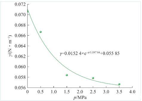 由圖4可知,水與瓦斯之間的表面張力隨著瓦斯壓力的增加而減小,表面張力與瓦斯壓力滿足負(fù)指數(shù)的關(guān)系,如式(3)所示。在水與瓦斯的界面,水分子兩側(cè)分別與瓦斯分子、液體分子接觸,表面分子受到的朝向液體內(nèi)部的吸引力大于氣體分子的吸引力。隨著瓦斯壓力的增加,水與瓦斯接觸表面之間的密度差逐漸減小,瓦斯分子對水分子的引力逐漸變大,抑制了液體表面分子向液體內(nèi)部的運(yùn)動(dòng),使系統(tǒng)的能量趨向于平衡狀態(tài)。因此,水與瓦斯之間的表面張力隨著瓦斯壓力的增加而減小。