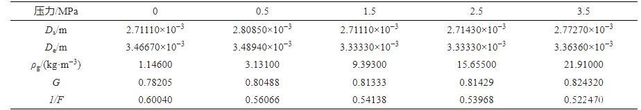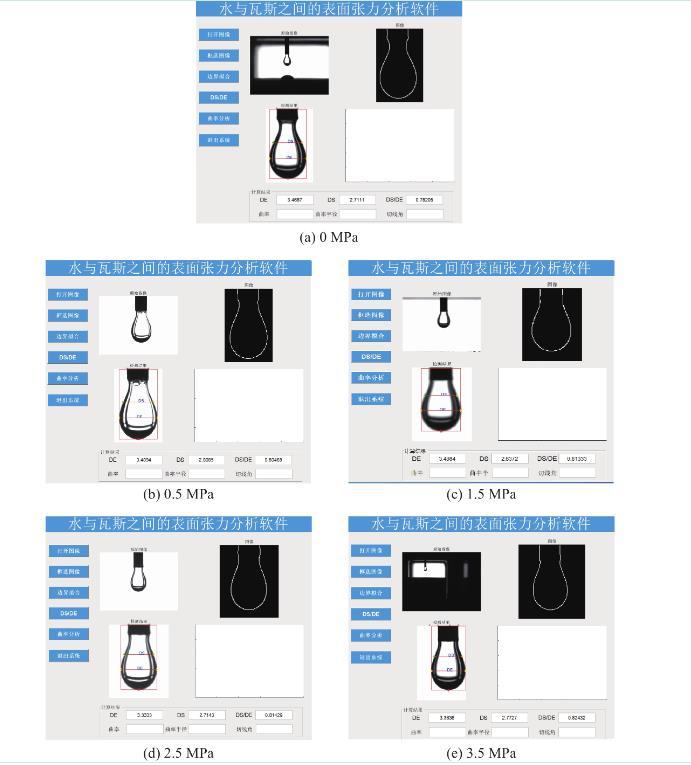 采用團(tuán)隊(duì)自開發(fā)的水與瓦斯之間的表面張力分析軟件對不同瓦斯壓力條件下的水滴形貌(圖3)進(jìn)行分析,即可獲得式(1)中的Ds及De。F為G修正后的形狀因子,F(xiàn)通過查表及插值法獲得,式(1)中的參數(shù)見表1,將表1中的參數(shù)帶入式(1)及式(2),即可獲得不同瓦斯壓力條件下水與瓦斯之間的表面張力(圖4)。