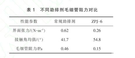毛細(xì)管力的作用使流體流動阻力增加,導(dǎo)致壓裂后壓裂液返排困難。如果地層壓力不能克服毛細(xì)管力,壓裂液濾液和殘?jiān)皆诹芽p表面,造成儲層孔隙堵塞和壓裂液無法返排,就會致使?jié)B透率降低,傷害儲層。為了減少壓裂液在地層的停留時(shí)間,須使用助排劑,降低壓裂流體的表面張力。以降低油水相間界面張力、增大與巖心表面接觸角兩方面為目標(biāo),選取不同助排劑進(jìn)行對比(見表1),優(yōu)選出具有較佳界面張力與接觸角平衡值的新型助排劑ZPJ-6。與常規(guī)產(chǎn)品相比,新型助排劑具有較低的界面張力和較高的接觸角,毛細(xì)管阻力相對減小。