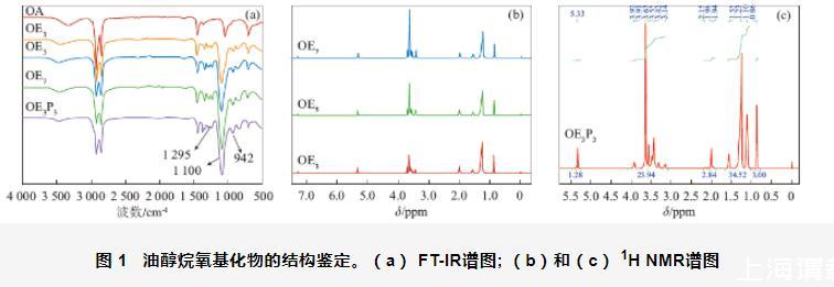 圖1油醇烷氧基化物的結構鑒定。(a)FT-IR譜圖;(b)和(c)1H NMR譜圖