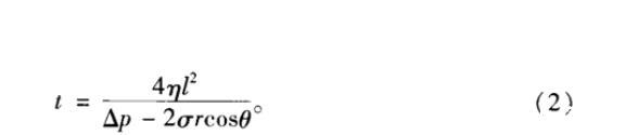 表示。式中,σ為表/界面張力,r為孔隙平均半徑,θ為潤濕角。因此,對于特定的儲層,破膠液表/界面張力越低且與巖石接近中性潤濕則返排能力越強(qiáng)。同時,根據(jù)Poiseulle方程,當(dāng)返排壓差為Δp時,從半徑為r、長為l的毛細(xì)管中排出黏度為η、表/界面張力為σ和接觸角為θ的液體所需時間