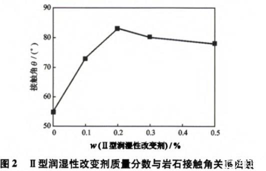 圖2Ⅱ型潤濕性改變劑質量分數與巖石接觸角關系曲線