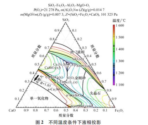 由圖1可知,液相生成量隨溫度升高而增大,當溫度高于1250℃時,液相形成加快。試驗中,堿度主要由改變CaO的含量來調(diào)節(jié),其它各組分基本不變。圖2中,當燒結溫度從1100℃升高到1600℃時,液相區(qū)域迅速增大,向Fe?O?角移動,此時有更多的Fe?O?熔化在液相中,有利于高強度鐵酸鈣的生成。隨著堿度提高(如圖中箭頭所示),在1500℃左右時,硅酸二鈣(Ca?SiO?)發(fā)生由α-Ca?SiO?向α’-Ca?SiO?的晶型轉變,晶型轉變引起體積膨脹,會影響燒結礦的強度。