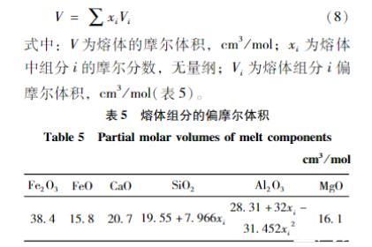 式中:V為熔體的摩爾體積,cm3/mol;x_{i}為熔體中組分i的摩爾分數(shù),無量綱;V_{i}為熔體組分i偏摩爾體積,cm3/mol(表5)。