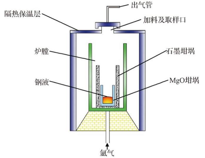 將重軌鋼鑄坯切成20 mm×15 mm×10 mm的鋼塊并打磨氧化皮,每爐試驗取約300 g鋼塊疊放在MgO質量分數(shù)為99.5%的坩堝中,并隨石墨坩堝一同放置在管式電阻爐中,調好程序緩慢加熱升溫,試驗裝置如圖1所示。當溫度升至600℃時,氬氣(質量分數(shù)為99.99%)流量控制為2.5 L/min,保持坩堝內中性氣氛,當溫度升至900℃時,氬氣流量調整為3.5 L/min,爐膛升溫至1 600℃后持續(xù)保溫30 min以保證鋼液熔化且均勻。