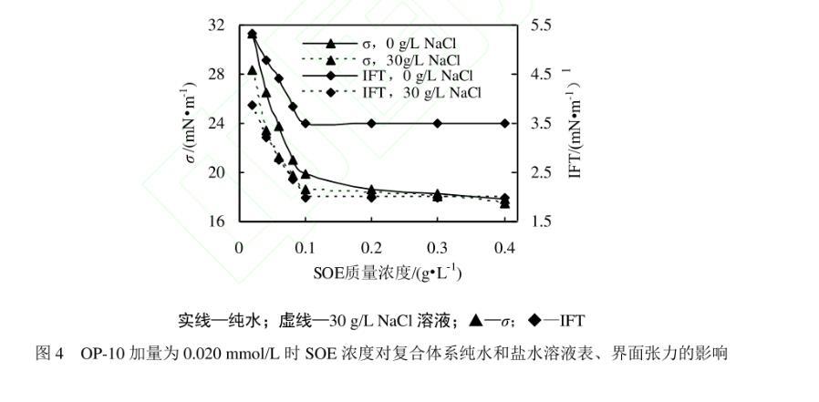 測試發現辛基酚聚氧乙烯醚-10(OP-10)在純水溶液中的ccmc為0.08 mmol/L(0.052 g/L),該濃度下溶液的表、界面張力分別為30.16 mN/m和5.68 mN/m;OP-10在30 g/L NaCl溶液中的ccmc為0.020 mmol/L(0.013 g/L),該濃度下溶液的表、界面張力分別為31.89 mN/m和8.61 mN/m。因此,選擇與SOE復合的OP-10的濃度為0.020 mmol/L。