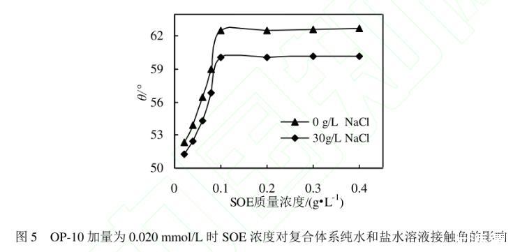 圖5 OP-10加量為0.020 mmol/L時SOE濃度對復合體系純水和鹽水溶液接觸角的影響
