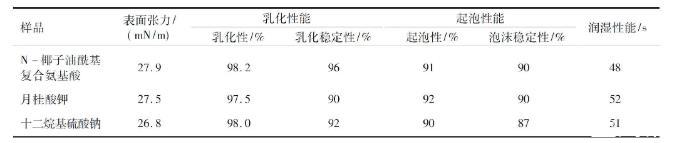 測定了以大豆粕為原料合成的N-椰子油?;鶑?fù)合氨基酸產(chǎn)物表面活性性能,同時與陰離子表面活性劑月桂酸鉀、十二烷基硫酸鈉表面活性進行了比較,結(jié)果見表4。