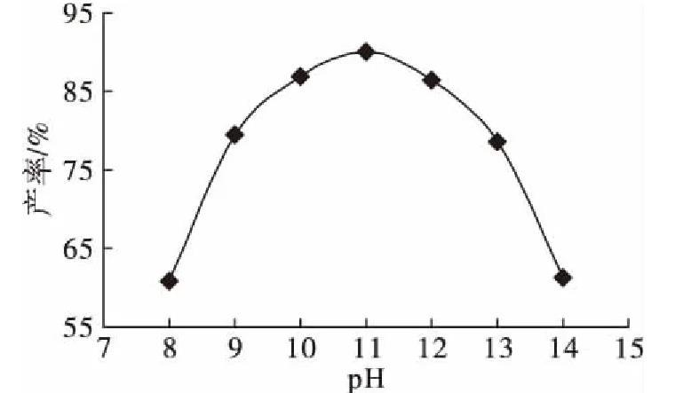 由圖2可以看出,pH影響產(chǎn)率的總體趨勢是首先逐步提高,達到最大值后逐步下降,pH為11時產(chǎn)物產(chǎn)率最大。因此,選擇pH 10~12進行優(yōu)化試驗。