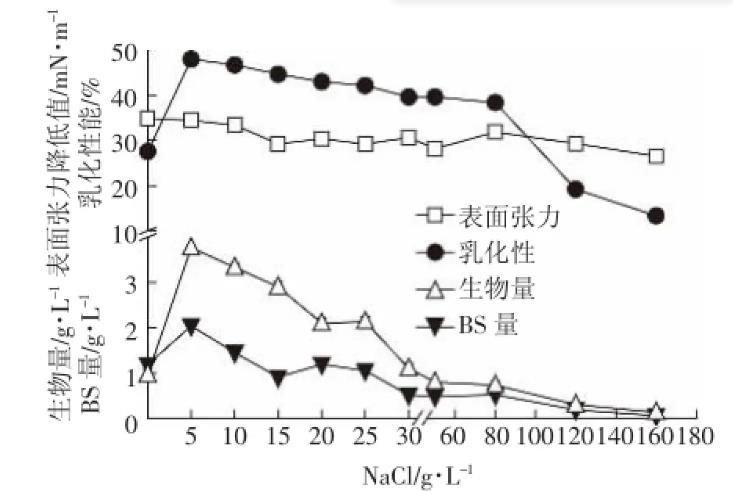 NaCl濃度通過改變細胞滲透壓影響微生物的生長與代謝,從而影響發酵產物的產量。由圖6可見,鹽濃度在0~5 g·L-1之間,細菌生長受到促進,而當鹽濃度大于5 g·L-1時,細菌的生長受到抑制,糖脂量與生物量趨勢一致。菌株的生物量、生物表面活性劑量、表面張力值與乳化性均在鹽濃度為5 g·L-1時呈現最大,說明該菌株具有一定的耐鹽性,與強婧等研究的生物表面活性劑產生菌Pseudomonas aeruginosa S6也能夠耐鹽相似。此外,本菌株在最高為25 g·L-1的鹽濃度條件下依然能夠存活,但此時已不能產生更多的生物表面活性劑。